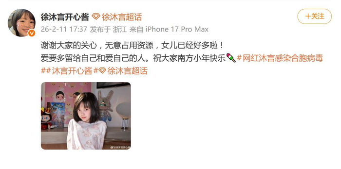 面对汹涌的关切,沐言的母亲在南方小年(2月11日)通过社交平台出面回应,安抚大众情绪。她表示“女儿已经好多啦”,并感谢公众的关心,同时也特别强调“无意占用公共资源”,并借此机会呼吁大家关注自身健康,做好冬季呼吸道疾病的防护。