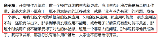 8月中旬,余承东在谈及鸿蒙操作系统的发展时,曾将移动操作系统和生态的建设,视为这是“先有鸡还是先有蛋”的哲学思辨。在他看来,操作系统刚发布,很多应用还没有做出来,用户能不能承受得了是一个问题。但如果等系统成熟了再发布,没有用户基础,大家也不愿意开发应用。“生态的迁移很难,以前有很多失败的案例,生态的开发工作量很大。”在余承东看来,在生态建设过程中,“刚开始用户发现微信、抖音的功能还不全,但迭代之后体验越来越好”。