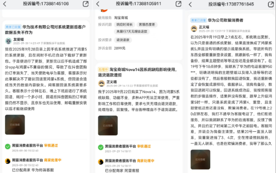 在黑猫投诉上,一位因升级至鸿蒙5遭遇App不兼容且导致“抖音团购订单消失”的用户诉称,自己在回退此前版本系统后,“抖音团购订单数据仍未显示”,且“京东也需要卸载重装后才能使用”。另有购买了预安装鸿蒙5系统的Nova14用户诉称,“因为鸿蒙5系统缺陷,功能不全,多种App无法正常使用,严重影响工作和日常生活,要求7天无理由退货却遭遇拖沓处理,平台各种理由不予退货退款。”