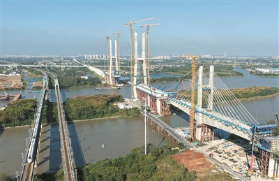 沪渝蓉高铁是国家“十四五”期间推动的重大基础设施项目。图为10月9日,在江苏省扬州市,沪渝蓉高铁跨京杭运河斜拉桥建设现场一派繁忙景象。