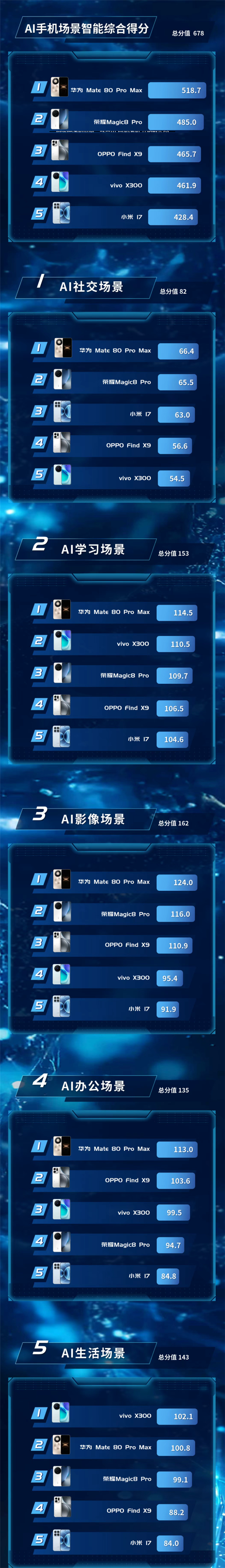在此次评测中,华为Mate 80 Pro Max以518.7分的AI手机场景智能综合得分位列第一,并包揽四大核心场景第一名,分别为AI社交场景、AI学习场景、AI影像场景和AI办公场景。