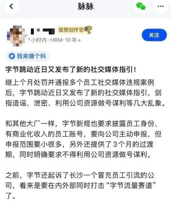 据相关网传内容显示,此次新规明确要求,对外披露员工身份、且存在商业化收益的个人账号,需主动向公司进行申报。