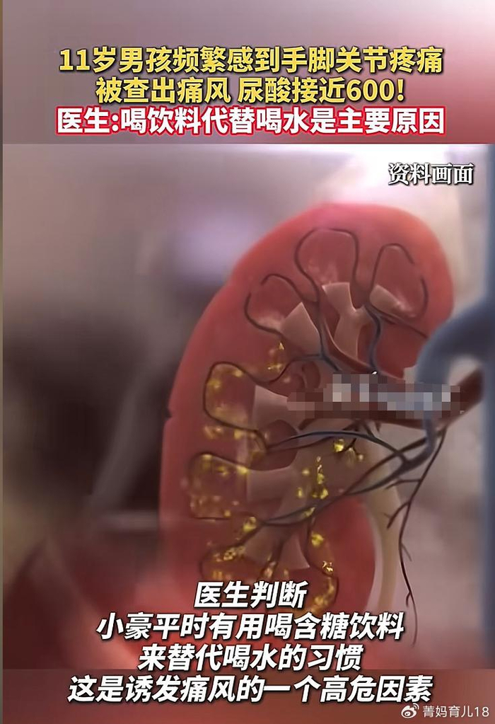 结果到了医院给孩子一检测,发现孩子尿酸非常的高,而且在孩子的关节方面已经有痛风了,详细地询问就发现这个孩子也是不爱喝水的,爱喝各种可乐,各种饮料当水喝。