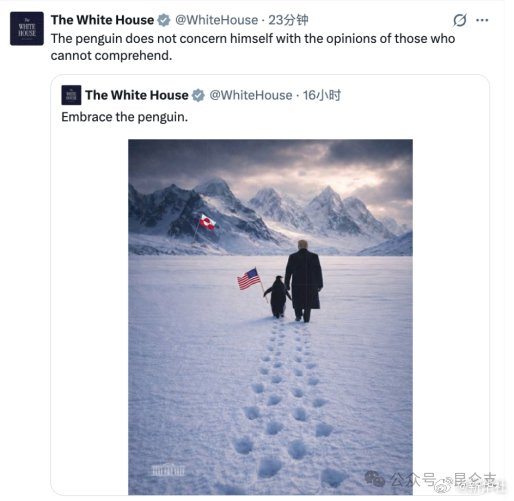[#白宫发了一张图新华社回了个动画#]白宫24日在社交媒体平台X上发布了一张人工智能合成图片,内容是美国总统特朗普与一只举着美国国旗的企鹅一起走在冰天雪地中,远处冰原上还插着一面丹麦自治领地格陵兰岛旗,图片配文“拥抱企鹅”。