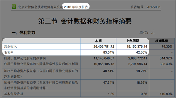 在很长的一段时间里,360doc 就靠这一单一盈利模式大赚,2014 年营收 1300 多万,2015 年 1500 多万,2016 年增长到了 2600 多万,毛利率也挺可观。