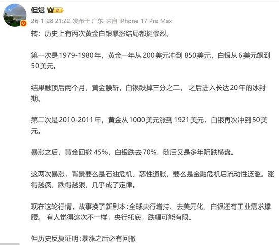 就在两天前,1月28日晚间,私募大佬但斌在其个人微博转发看空黄金言论,引发网友热议,有网友点评其“吃不上葡萄说葡萄酸”。