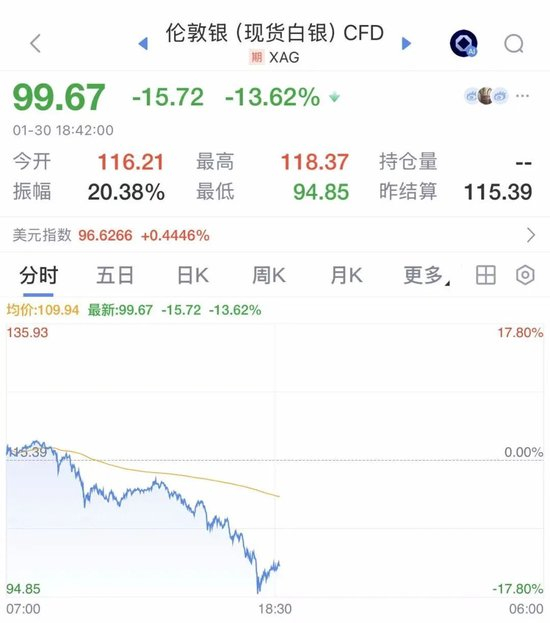 与此同时,国际银价也急转直下,现货白银跌破100美元大关,一度跌超17%。