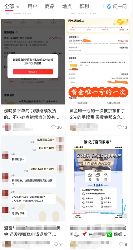 记者浏览发现,社交平台上有不少网友提及被扣款的经历,其中有人因退货金条产品被平台扣款超千元。有受访消费者表示理解黄金的投资属性,也愿意支付手续费。但还是觉得5%的比例偏高,且其申请退款时平台并未明显提醒称要扣手续费(退货规则一般在商品详情页中)。