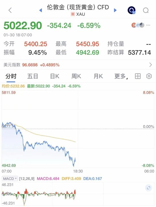 1月30日,国际金价大跳水,现货黄金从最高5450美元/盎司一路下跌,一度跌破5000美元,最大跌幅达8%。